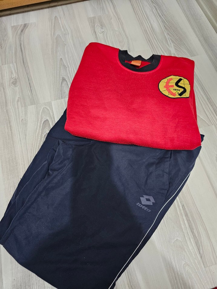 Koyu kırmızı baskılı, bisiklet yaka ve bol kesim sweatshirt ile siyah, cırt cırtlı eşofman takımı. Trendy sokak stili için uygundur. ️