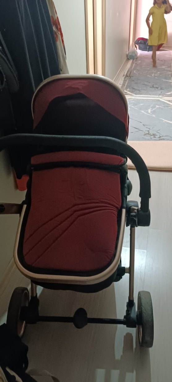 Koyu kırmızı renkte, yumuşak dolgulu oturma alanı ve sağlam çerçeveye sahip bebek arabasıdır.