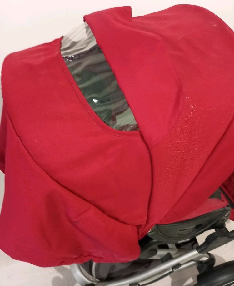 Koyu kırmızı tente ve şeffaf pencereye sahip bebek arabası, sağlam çerçevesiyle güvenli bir kullanım sunar.