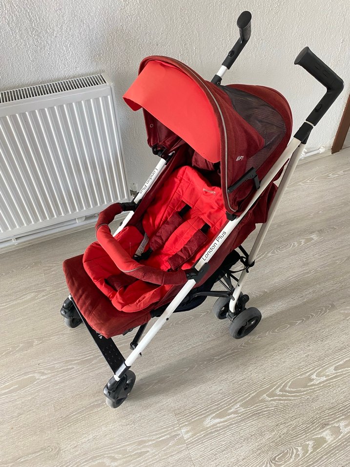 Koyu kırmızı bebek arabası, tente, yastıklı oturma yeri ve ayarlanabilir emniyet kemeri ile konfor ve güvenlik sağlar. Dört çift tekerlek ve ergonomik tutacaklara sahiptir.