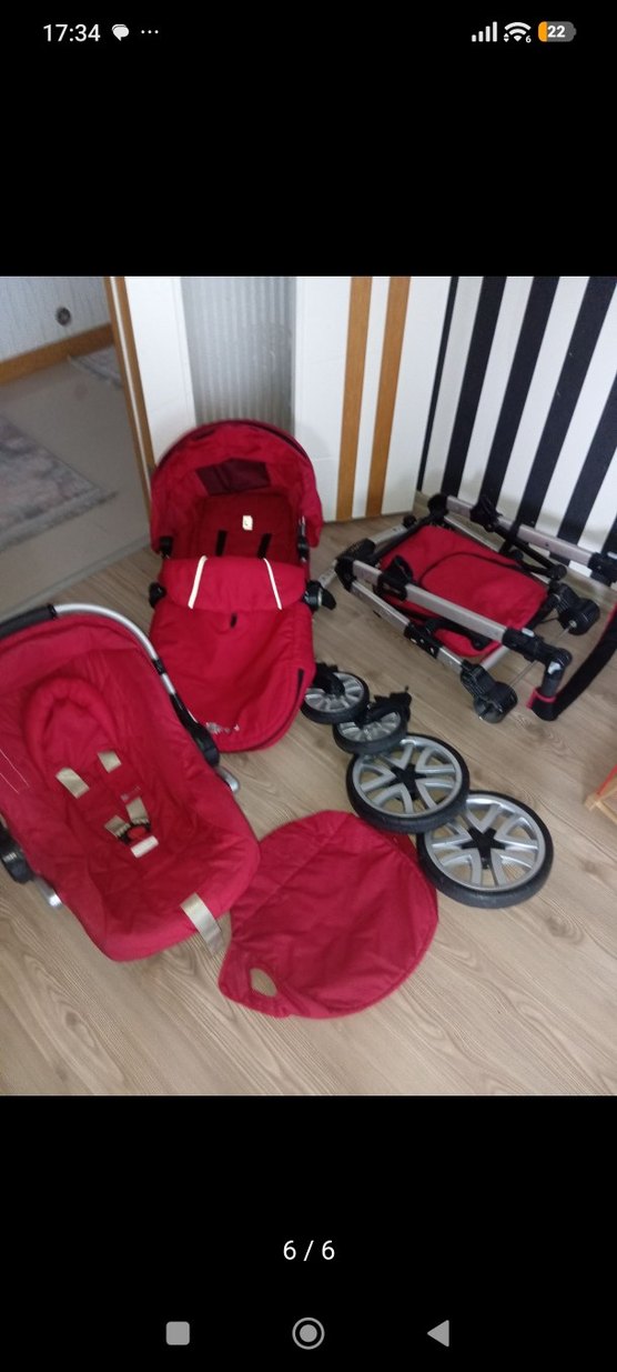 Koyu kırmızı bebek arabası seti, kolay montaj ve taşıma için çıkarılabilir koltuk, tekerlek ve şase içerir. Çok severek kullandım.Bebek arabası için yaptığım en iyi tercih. Araba çok şık duruyor. Zaten görünüşü çok hoşuma gitti kullanışı ayrı bir hoşuma gitti. Ergonomik bir ürün. Dar bagajlarda sığmadığında tekerleklerini tek tuşla rahatlıkla çıkarabiliyorum. Büyük pusetin üst bez bölümü iskeletten tamamen çıkarılabiliyor rahatlıkla yıkayabilirsiniz.büyük pusetre dikilebilir ufak bir yırtılma var.resimlerde gördüğünüz gibi katlandığında çok az yer kaplıyor. Üst puset bölümleri ikisi de arabanın içinde kendi güvenlik kemeri ve arabanın güvenlik kemeri ile rahatlıkla sabitlenebiliyor. Açılıp kapanması, tekerlekleri sağlam ve çalışıyor çalışmayan bir bölümü yok. Kendi iç minderi var. İsterseniz kendiniz de diktirebilirsiniz. Fazlalık nedeniyle satıyorum.