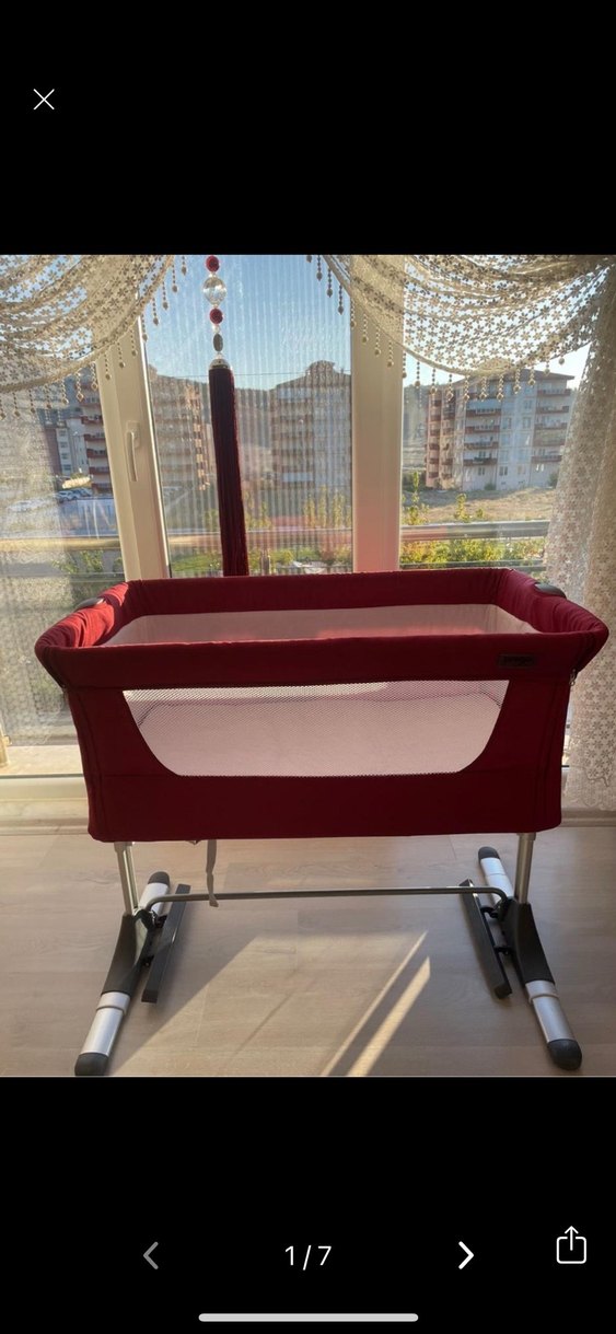 Koyu kırmızı beşik, nefes alabilen file yanlar ve tekerlekli sağlam metal çerçeveye sahiptir. Bebekler için güvenli ve rahat bir alan sunar. ️