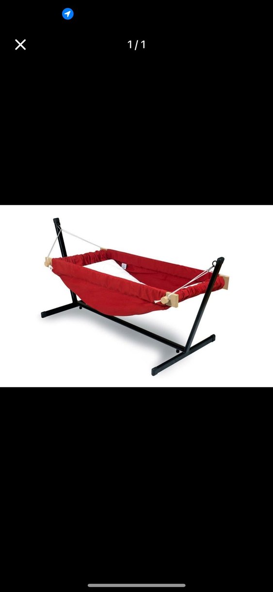 Koyu kırmızı kumaş sepet ve sağlam siyah metal iskeletten oluşan bebek beşiği, rahat bir dinlenme alanı sunar. ️