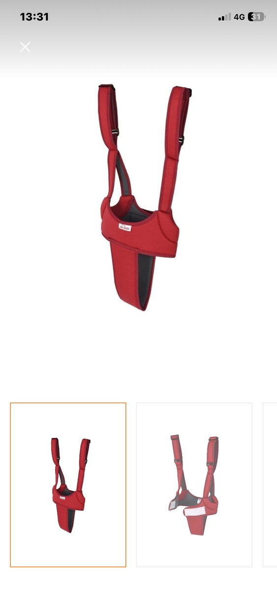 Koyu kırmızı renkte, omuz askıları yastıklı ve bebeği rahat taşıyacak şekilde tasarlanmış bebek taşıyıcıdır.