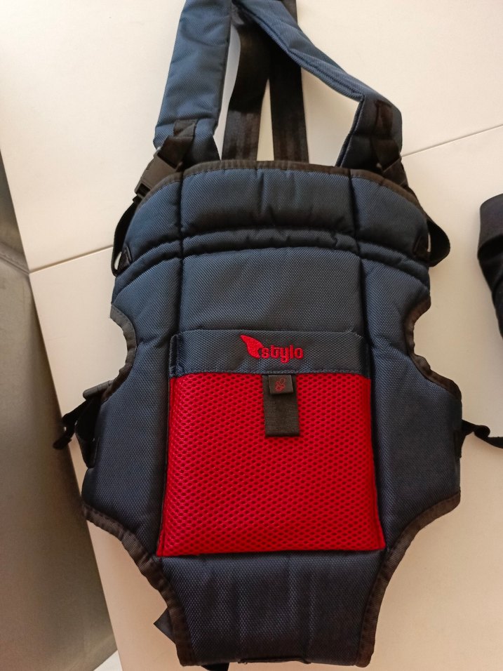 Koyu kırmızı bebek taşıyıcı, yastıklı askılar ve havalandırma için file ön cep içerir. Ayarlanabilir ve güvenli oturuş sağlar. Çok sağlamdır ve kaliteli