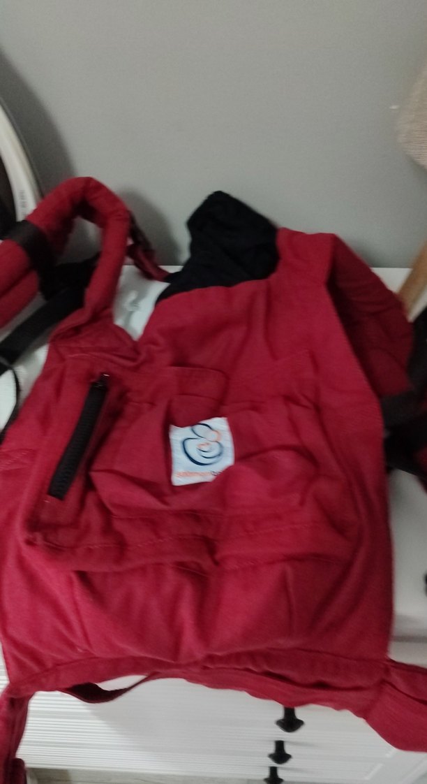 Ayarlanabilir askılı ve ön cepli koyu kırmızı bebek taşıyıcı. Bebek taşımak için rahat ve güvenlidir.