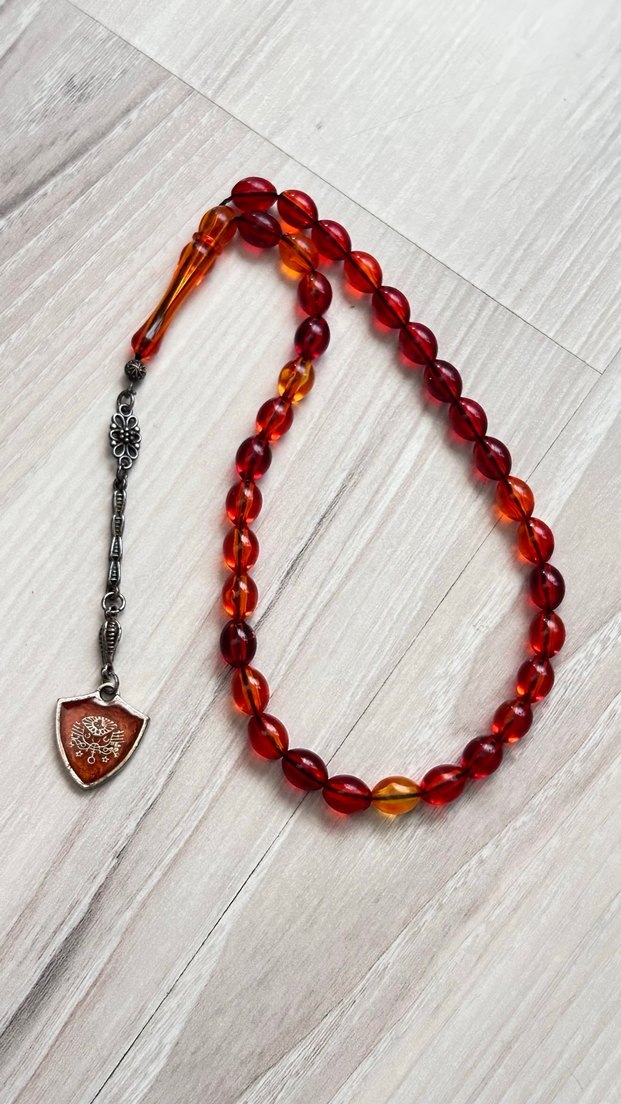 Koyu kırmızı renkte, yuvarlak boncuklu ve metal püsküllü bohem tarzda erkek tespih. Koleksiyon ve kullanım için uygun.gümüş olması gerek çekmeye çalıştım ama ayarı silinmiş