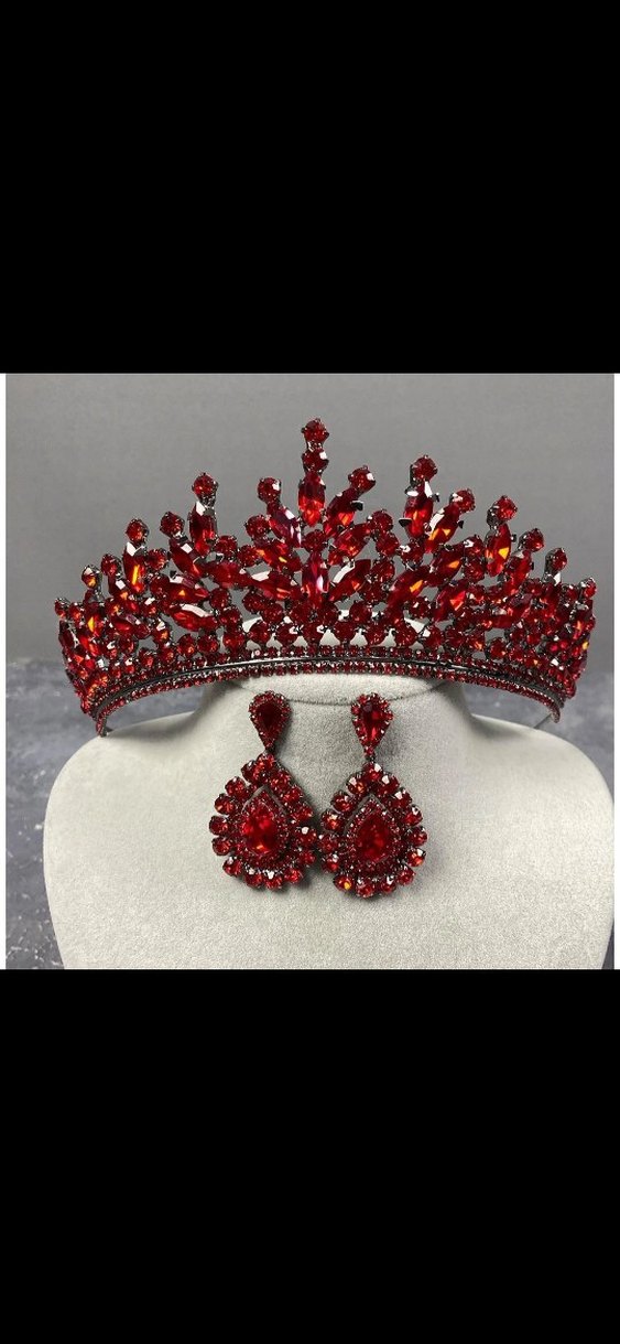 Koyu kırmızı cam taşlarla süslenmiş taç ve uyumlu küpelerden oluşan set, gösterişli ve gotik tarz için uygun.