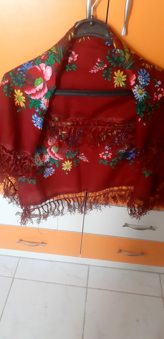Koyu kırmızı renkte, canlı çiçek desenlerine ve ince püsküllere sahip, bohem tarzda drapeli kadın şalı. Éşarp