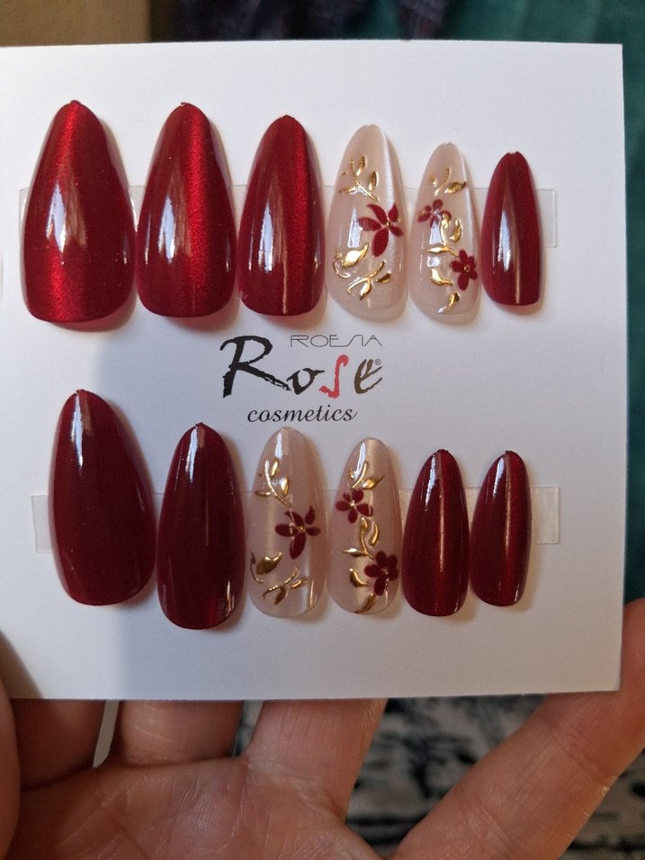 Parlak görünümlü, bazı tırnaklarda çiçek desenli koyu kırmızı tırnak süslemeleri. Rvse kozmetikten.