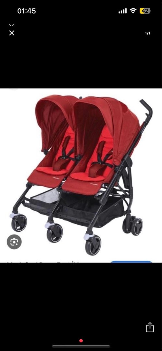 Koyu kırmızı çift bebek arabası, ayarlanabilir tente ve güvenli emniyet kemerleri ile iki çocuk için uygundur. Depolama sepeti ve döner tekerlekler içerir. Biraz deformesi vardır o sebeple uygun tutuyorum fiyatı sürüşünde hiç bir sıkıntı yok