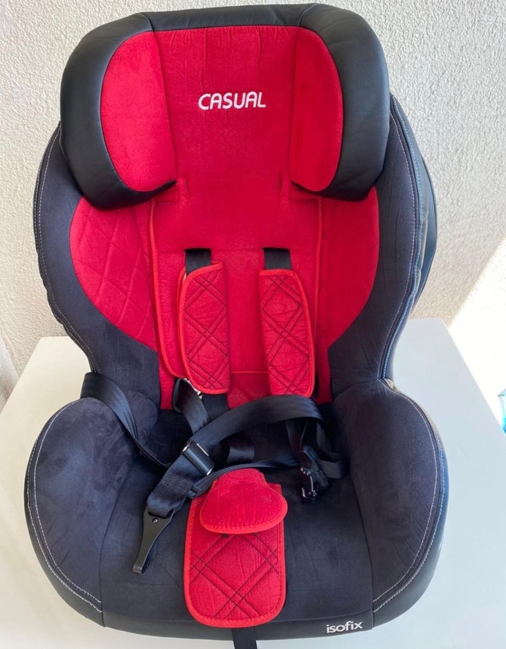 Koyu kırmızı ve siyah renkli, konforlu yastıklı çocuk oto koltuğu. Başlıkta CASUAL markası işlenmiştir, ISOFIX sistemi bulunur.