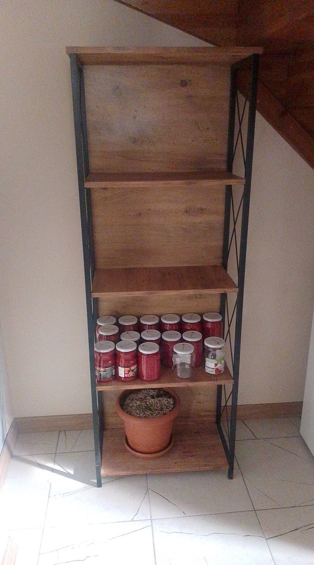 Ahşap raflı, metal çerçeveli koyu kırmızı çocuk rafı, kavanoz ve saksılar için uygun. 50 cm genişlik 1.70uzunluk