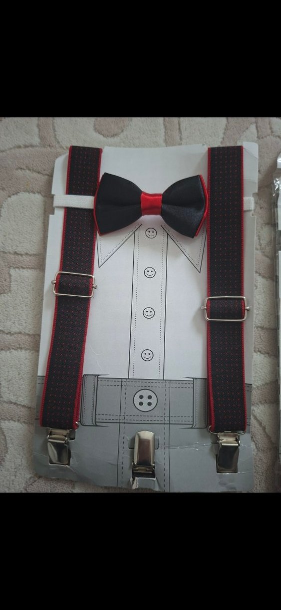 Koyu kırmızı desenli çocuk askısı ve uyumlu papyon, metal tokalı ve sentetik kumaştan üretilmiştir. Gotik tarz için uygundur. 8 9 yaşa kadar uyar