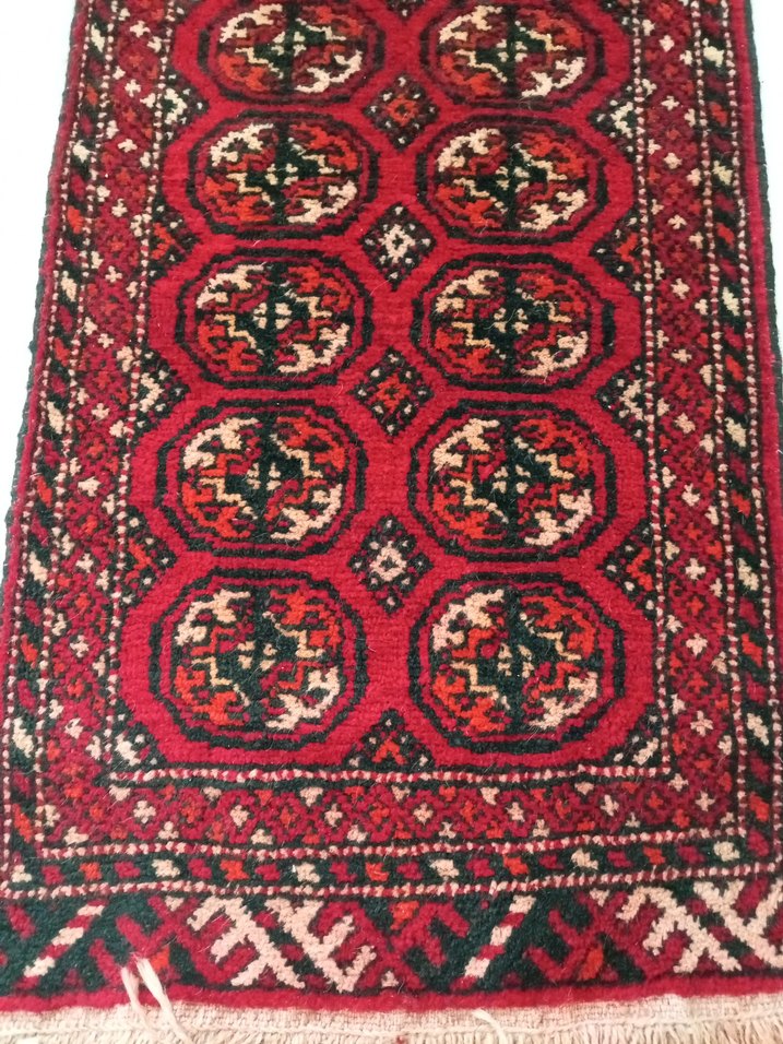 Koyu kırmızı renkte, detaylı desenlere sahip geleneksel tarzda bir halı.