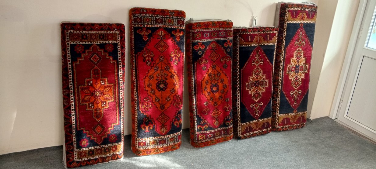 Koyu kırmızı renkte, geleneksel desenlere sahip detaylı bir halıdır. Mekâna klasik bir hava katar. Kök boyalı el dokuma yastık beş adet mevcut iki çift bir tek var ölçüler profilde mevcut Belirtilen fiyat adet fiyatıdır