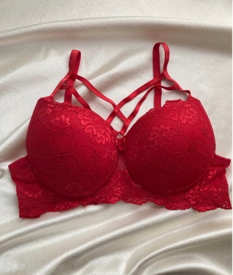 Koyu kırmızı renkte, dantel detaylı, çift askılı ve çapraz tasarımlı gösterişli sütyen. İçi dolgulu