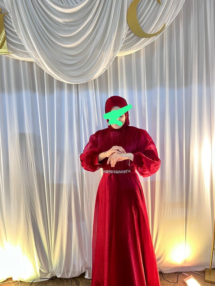 Yüksek yakalı, uzun kollu, bol kesim koyu kırmızı uzun abiye elbise. Drapeli tasarım ve batik desenli, modest ve avangart stil sunar.