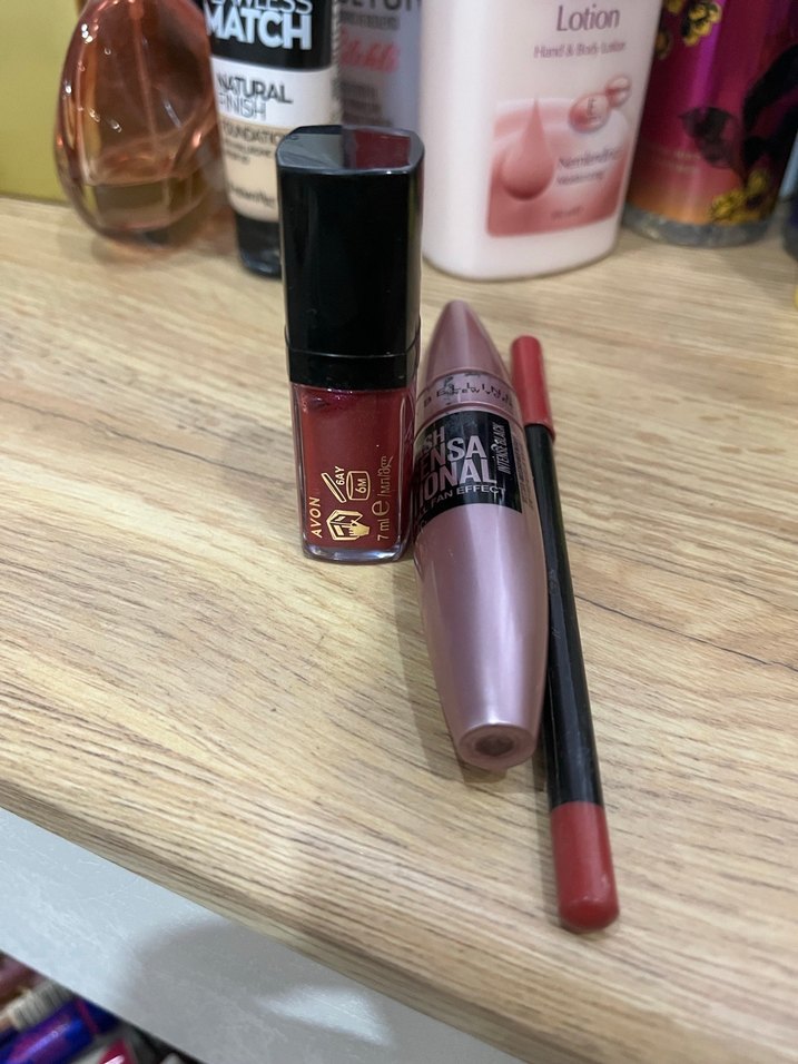 Koyu kırmızı ruj, uyumlu dudak kalemi ve maskaradan oluşan makyaj seti.