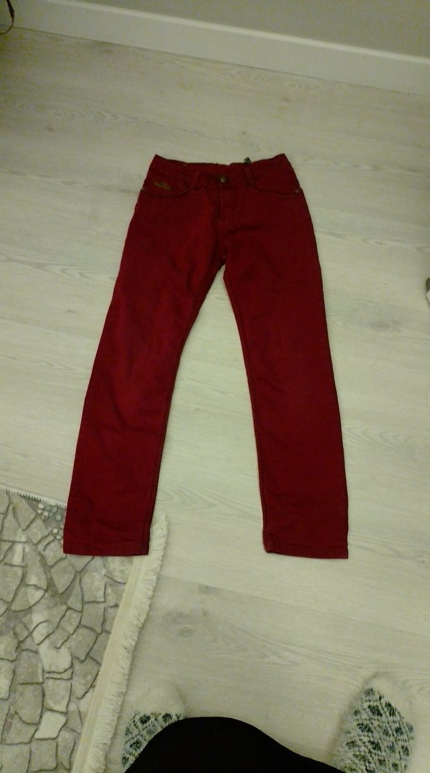 Koyu kırmızı, düğmeli ve regular fit erkek çocuk pantolonu. Sentetik yumuşak kumaştan, günlük sokak stiline uygun.