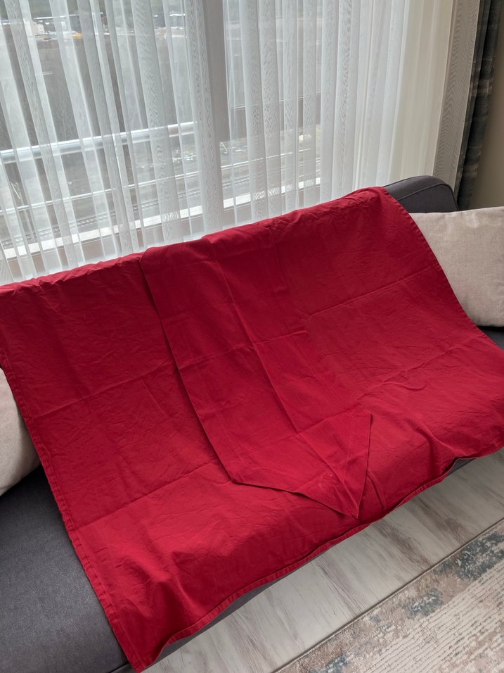 Koyu kırmızı, desensiz ve düz yüzeye sahip masa örtüsü, sofranıza güçlü bir dokunuş katar. ️ Runner aynı renk ucunda hafif leke vardır