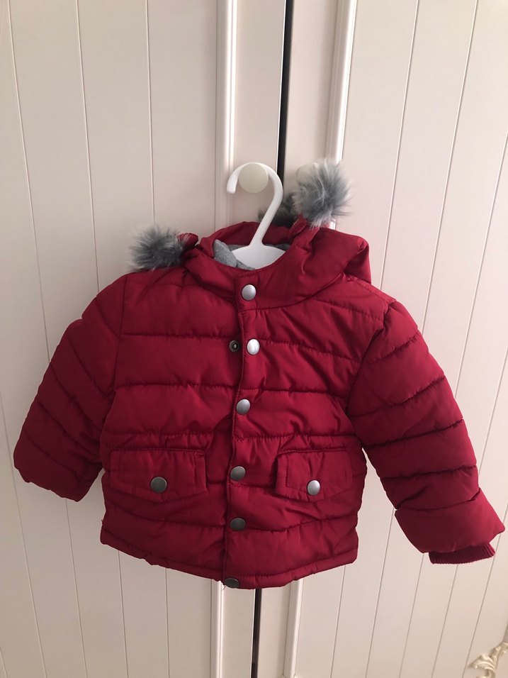Düğmeli, kapüşonlu ve yumuşak, sıcak tutan kumaştan yapılmış koyu kırmızı erkek çocuk montu.