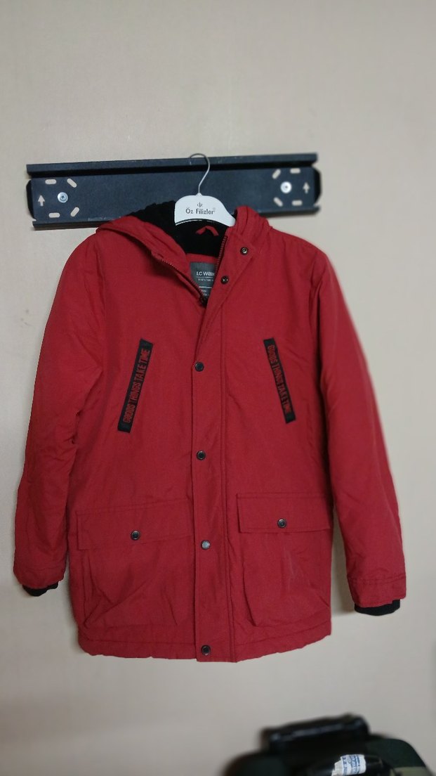 Düğmeli ön ve kesimli yaka detaylı, yumuşak ve sıcak kumaştan yapılmış koyu kırmızı erkek çocuk ceket. Rahat kalıplı ve baskılı desenli, trend sokak stili için uygun.