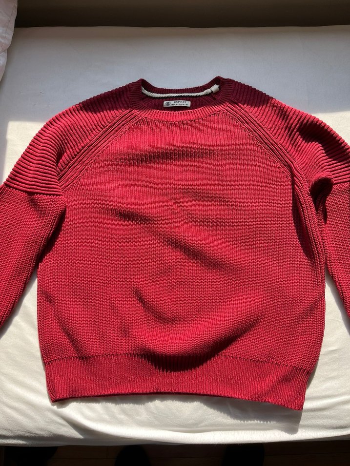 Koyu kırmızı renkte, yuvarlak yaka ve uzun kollu erkek pamuk kazak. Rahat kesimi ve normal uzunluğu ile günlük kullanıma uygundur. 2 kez giyildi, sorunu yok.