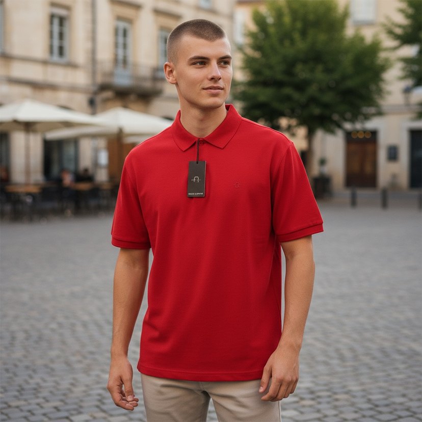 Koyu kırmızı renkte, polo yaka ve kısa kollu, rahat kesim erkek tişörtü. Yumuşak ve sıcak kumaştan, günlük dış mekan kullanımı için uygundur.