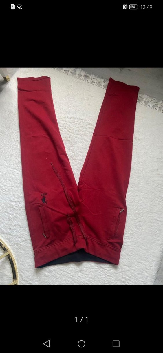 Koyu kırmızı, fermuarlı cepleri olan, yumuşak kumaştan üretilmiş dar kesim erkek eşofman altı. Midi boyda, günlük rahat sokak stiline uygun.
