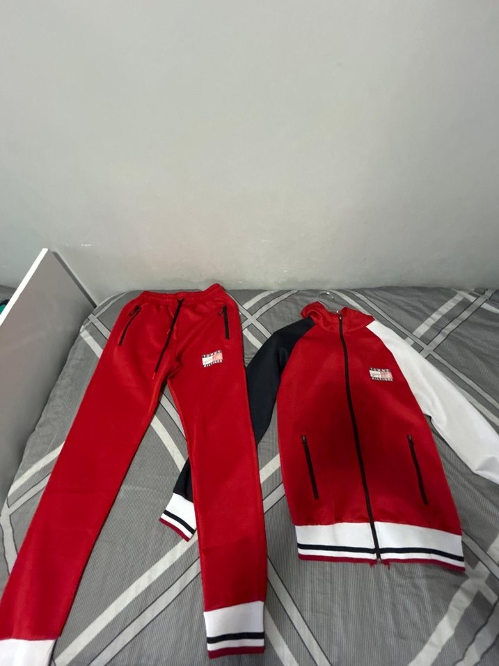 Koyu kırmızı renkli, fermuarlı cepleri ve yüksek yakası olan, pamuksu yumuşak kumaştan yapılmış erkek eşofman takımı. Siyah ve beyaz kollu, rayalı manşet detaylıdır.