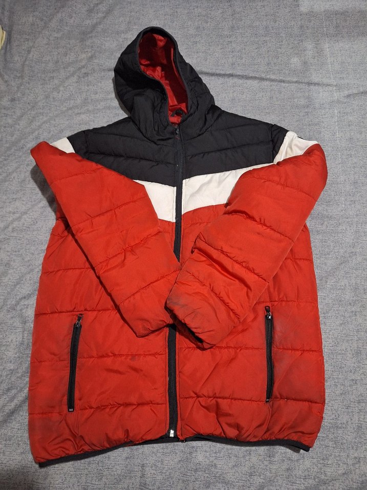 Fermuarlı ve yüksek yakalı, koyu kırmızı, siyah ve beyaz detaylı, sokak modası tarzında erkek montu. Yumuşak ve sıcak kumaştan üretilmiştir.