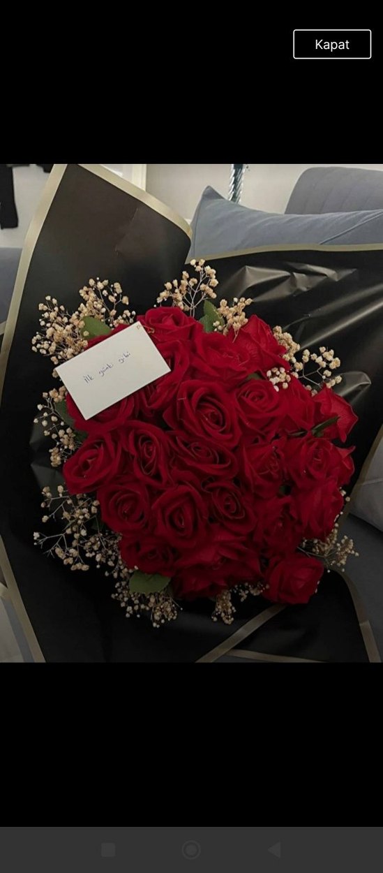 Küçük notlu, siyah kağıda sarılı, narin beyaz dolgu çiçekleriyle süslenmiş koyu kırmızı gül buketi.