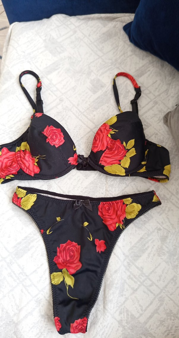 Koyu taban üzerinde canlı kırmızı ve sarı güllerle vintage goth tarzı sütyen. Ayarlanabilir askılar ve klasik kesim sunar.
