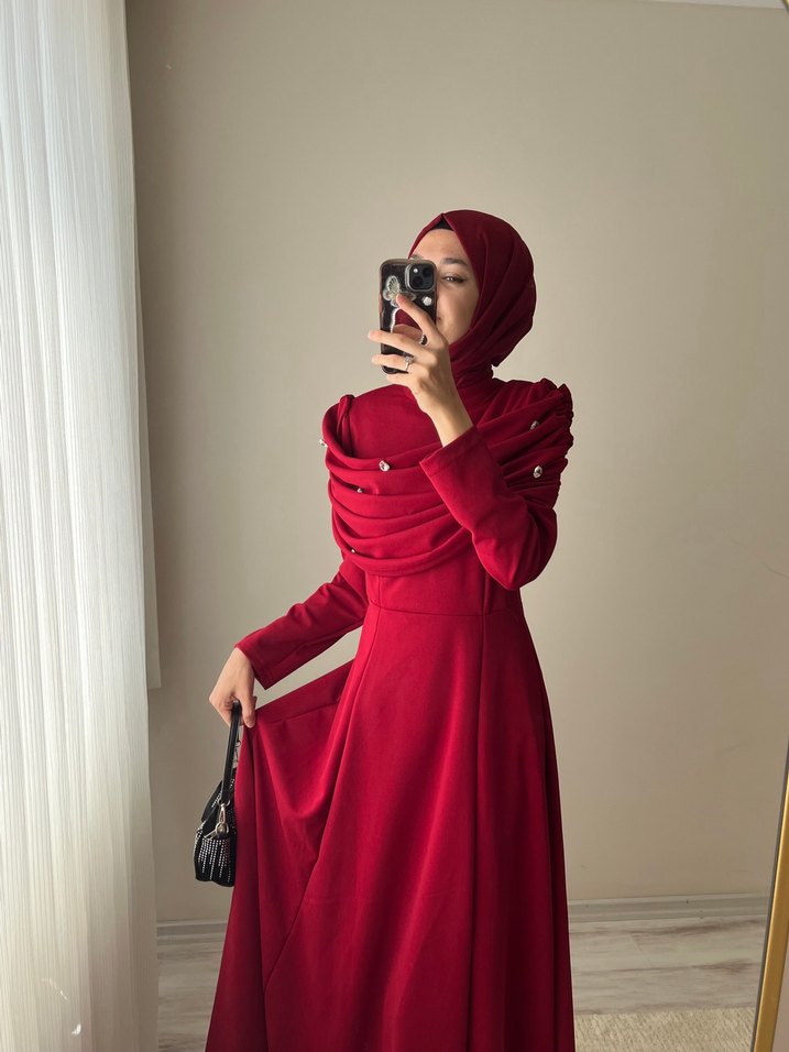 koyu kırmızı, ipek görünümlü, drapeli abiye tarih için yazabilirsiniz şal dahildir satın almayınız k&ra
