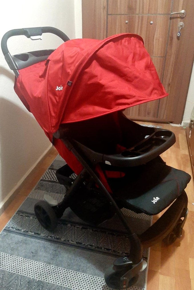 Koyu kırmızı Joie bebek arabası, tente, güvenlik tepsisi ve ayak dayama yeri ile rahat oturma sağlar. Dayanıklı iskelet ve rahat sürüş için tekerlekleri bulunur.