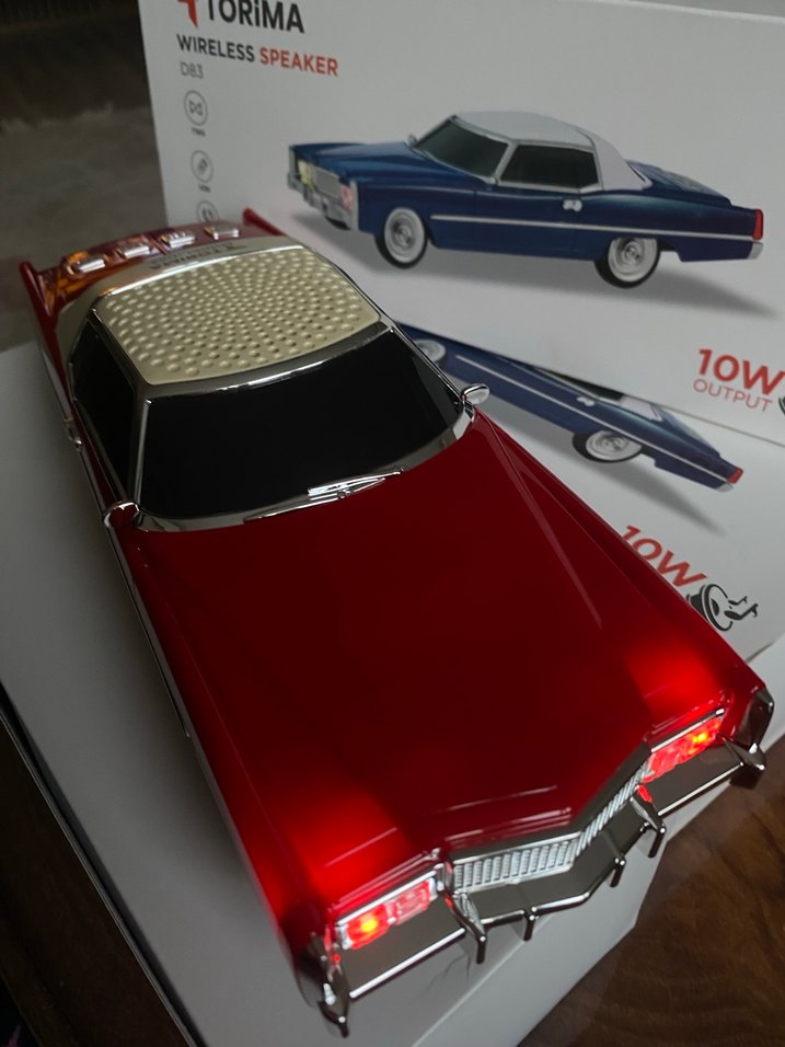Koyu kırmızı renkte, 10V çıkışlı kablosuz hoparlörlü TORiMA marka Klasik tasarım ve ses işlevi bir arada.