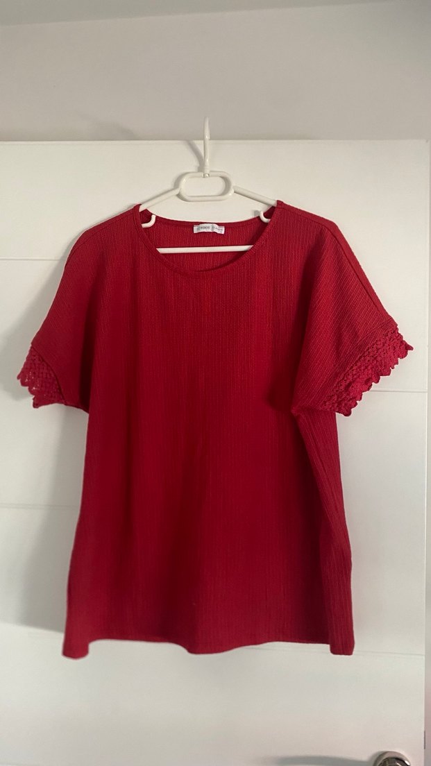 Koyu kırmızı renkte, keten kumaştan üretilmiş kadın bluz. Kısa kollu, pileli detaylı ve yuvarlak yaka. Gevşek kesim, midi boyda ve günlük kullanım için uygun minimal tasarım.
