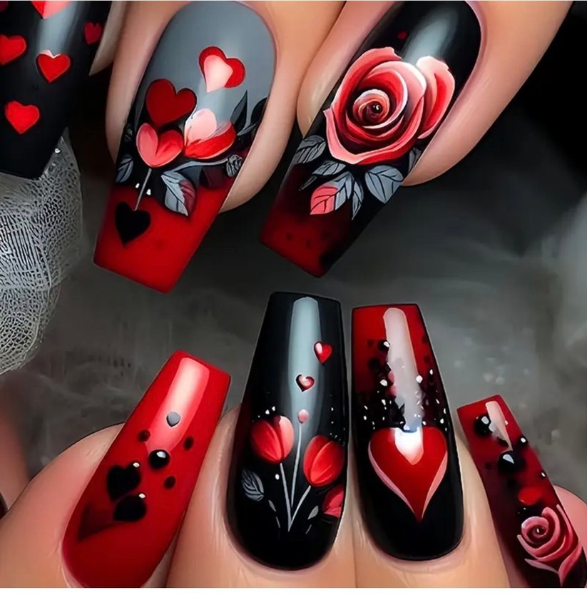 Koyu kırmızı ve siyah renklerde kalp, gül ve çiçek desenli parlak tırnak seti. Cesur bir görünüm için uygundur. Jel yapıştırıcı ve törpü ile birlikte gönderilecektir.