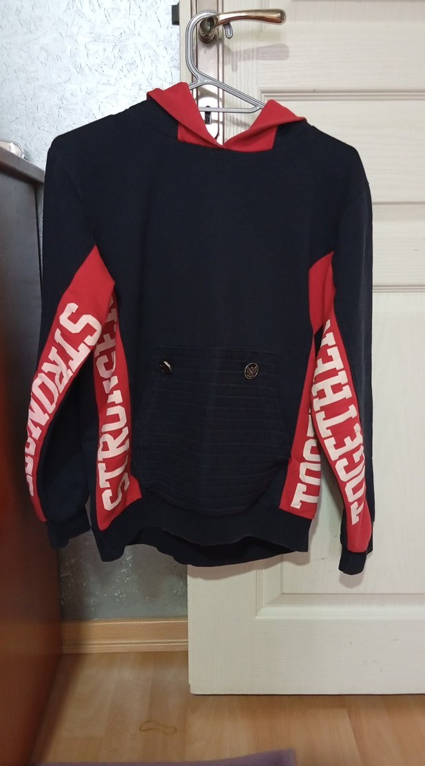 Koyu kırmızı ve siyah renklerde, kapüşonlu ve düğmeli detaylı, baskılı desenli, uzun kollu ve dar kesim erkek sweatshirtü.