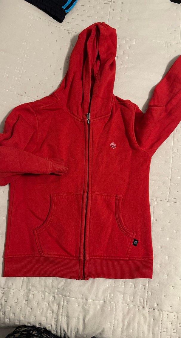 Koyu kırmızı renkte, fermuarlı ve kapüşonlu erkek sweatshirtü. Uzun kollu, yumuşak fleece kumaştan, günlük sokak stili için uygun.
