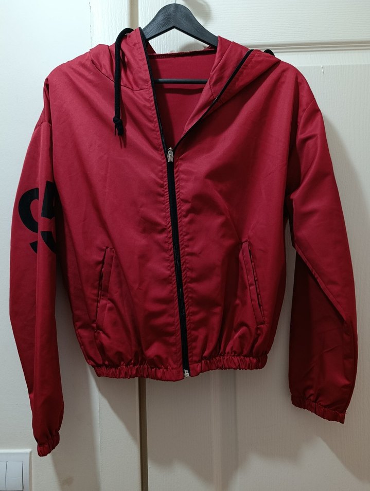 Koyu kırmızı renkte, kapüşonlu ve fermuarlı kadın ceketi. Bol kesim, uzun kollu ve yakası kırma, düz desenli, sentetik kumaştan günlük kullanıma uygun.
