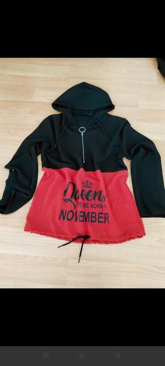 Kadınlar için kapüşonlu, uzun kollu ve bol kesimli bu sweatshirt, fermuarlı ön kısmıyla dikkat çekiyor. Koyu kırmızı ve siyah renk bloklu, 'Queens were born in November' baskılıdır. Yumuşak ve sıcak kumaştan yapılmıştır.