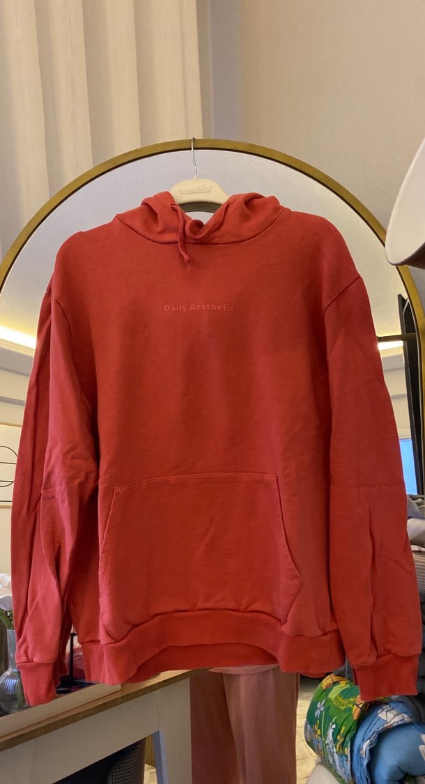Koyu kırmızı renkte, uzun kollu, yuvarlak yaka ve bol kesim sweatshirt. Yumuşak ve sıcak kumaştan üretilmiş, ön cep ve kapüşonlu. Günlük rahat kullanım için uygundur.
