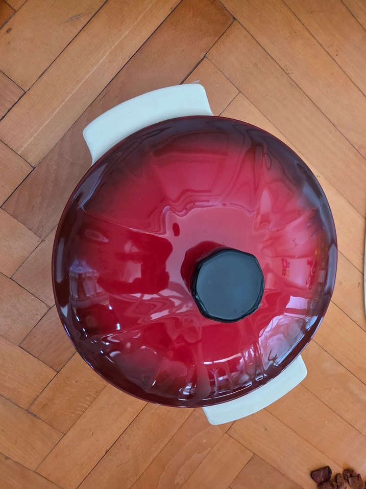 Koyu kırmızı renkli, porselen ve siyah kulplu kapaklı kek kalıbı ve pişirme kabı.
