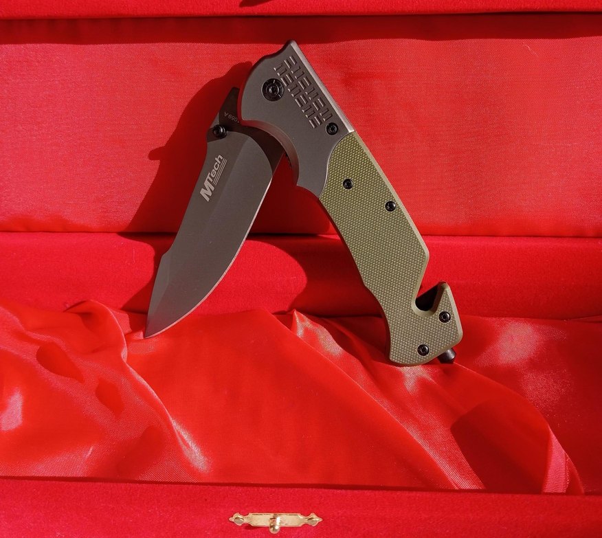 Koyu renkli bıçağı ve dokulu yeşil sapı olan MTech katlanır bıçak, canlı kırmızı kutusunda sunulmaktadır. Cam kırıcı ve emniyet kemeri kesici içerir.