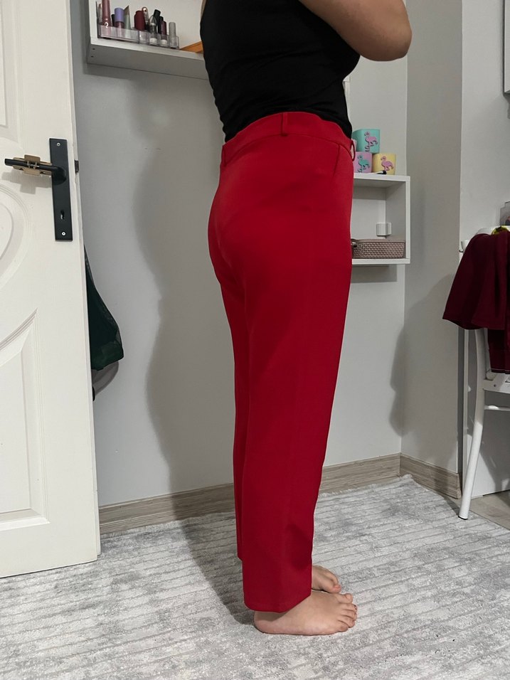Koyu kırmızı midi uzunlukta, regular fit kadın kumaş pantolon. Düz desensiz ve sentetik dokusuyla ofis stiline uygun, zahmetsiz şıklık sunar.