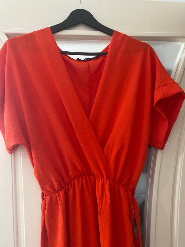 S beden Koyu kırmızı tulum , V yaka ve kısa kollu. Salaş kesim ve drapeli tasarımıyla sentetik dokulu kumaştan üretilmiştir.