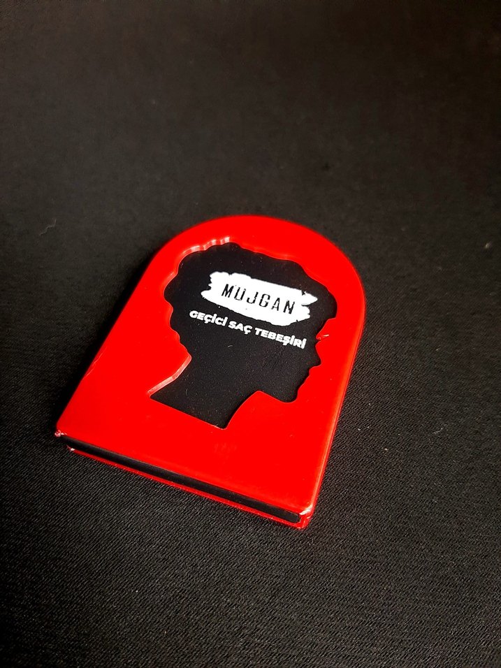 Koyu kırmızı renkte, MUJGAN yazılı ve siluet tasarımlı saç tebeşiri. Punk ve avangart tarzı yansıtır.