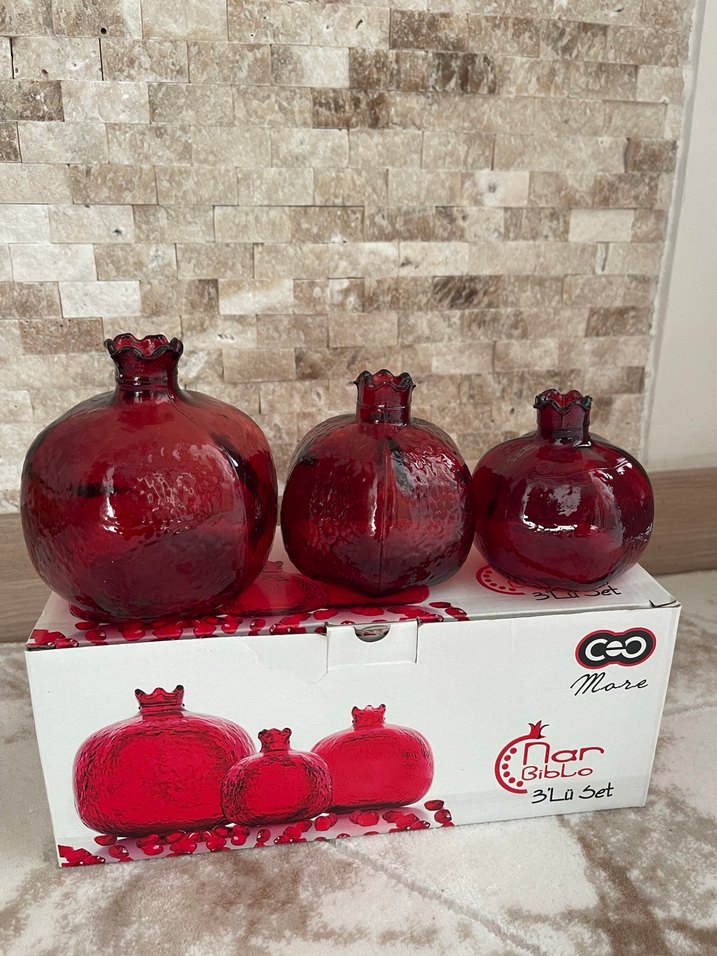 Koyu kırmızı renkte, camdan yapılmış üçlü nar biblo seti. Her biblo dokulu yüzeye ve taç şeklinde üst kısmı vardır. Kutusunda satılır.
